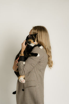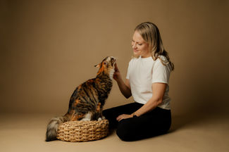 Olemme kuvanneet Jennan kanssa myös hänen yrityksen alkutaipaleella ja nyt Jenna kaipasi päivitettyjä kuvia markkinointiin. Jenna valokuvaa paljon lemmikkejä ja hänelle tärkein inspiraatio valokuvaukseen on hänen omat kissansa, Lili & Mochi. Siksi oli hyvin tärkeää kuvata yhteiskuvia molempien kissojen kanssa sekä halusimme toteuttaa kuvan, jossa olisi molemmat kissat samaan aikaan. Kuvaus oli helpoin toteuttaa Jennan studiolla, johon kissat olivat jo tottuneet.